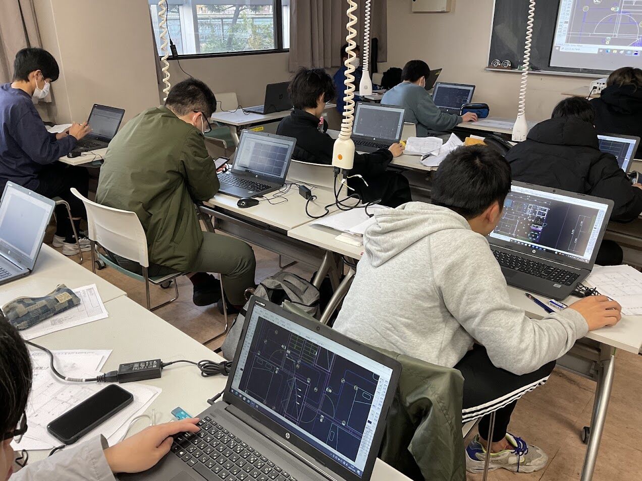 蒲田校電気工事コース2年生も卒業まで残りわずかとなりました。これからは社会人に向け最後の追い込みとなります。安全講習会も残っていますが、先ずは卒業課題であるCADを使っての「屋内電気配線設計」の仕上げが迫っています。施工管理技士を目指すためには必須となる課題です。ガンバレ!!(蒲田U)